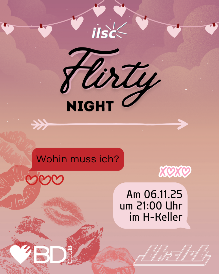 Heute wird geflirtet! Genießt einen tollen Abend, der die beste Gelegenheit bietet neue Leute kennen zu lernen und zur Musik zu tanzen. Mit den Knicklichtern, welche ihr euch am Eingang abholen könnt, seht ihr direkt was euer gegenüber sucht (oder eben auch nicht) und falls ihr doch ein wenig zu schüchtern neue Leute anzusprechen habt ihr die Möglichkeit kleine Texte für sie an der Bar abzugeben.